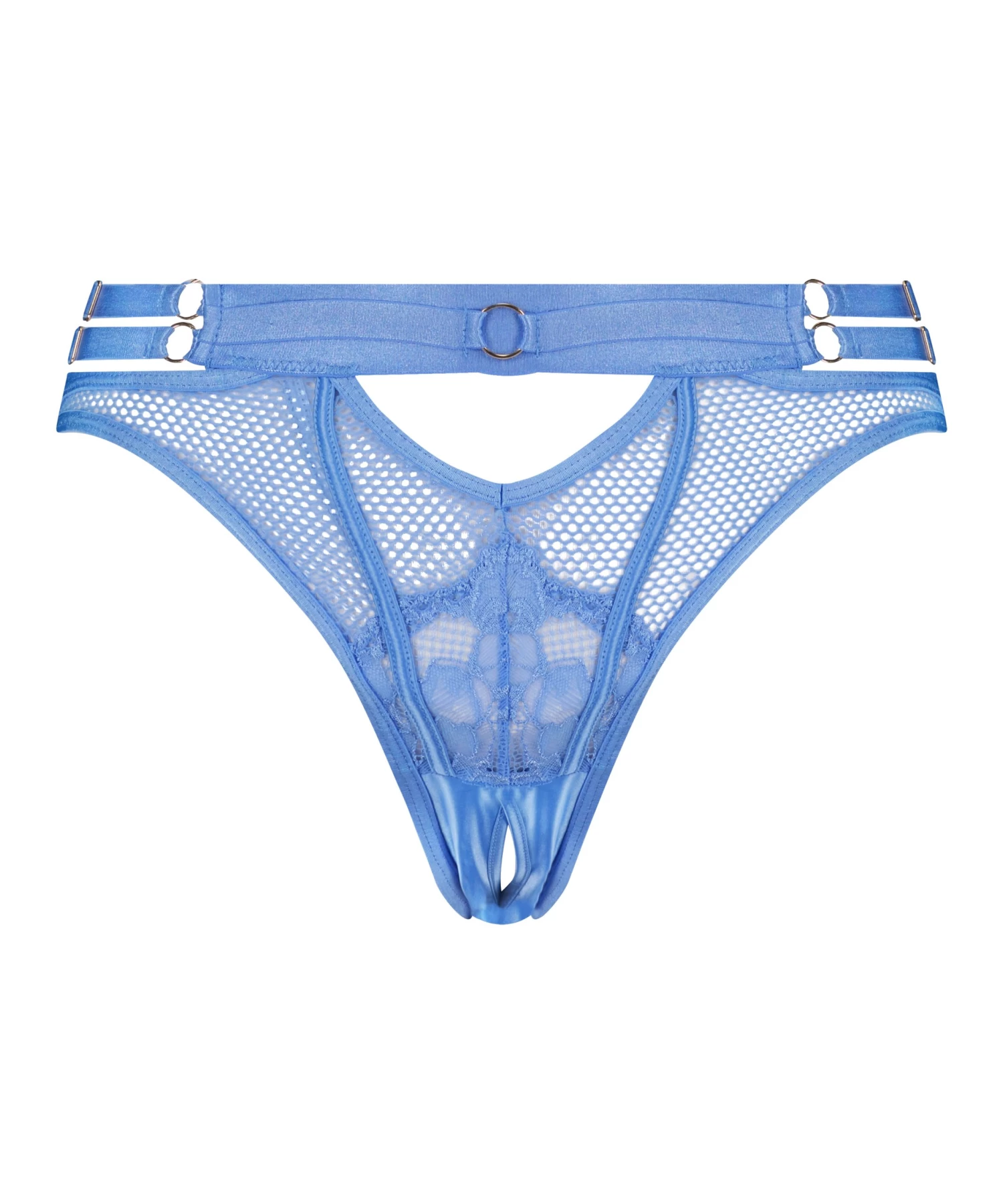 Ga een stapje verder met deze super sexy string! Gemaakt van netstof, gedecoreerd met kant en bandjes voor een pittige look. Met opengewerkte details aan de voor- en achterkant en metalen details op de dikke band. Maak de look compleet met de bustier!