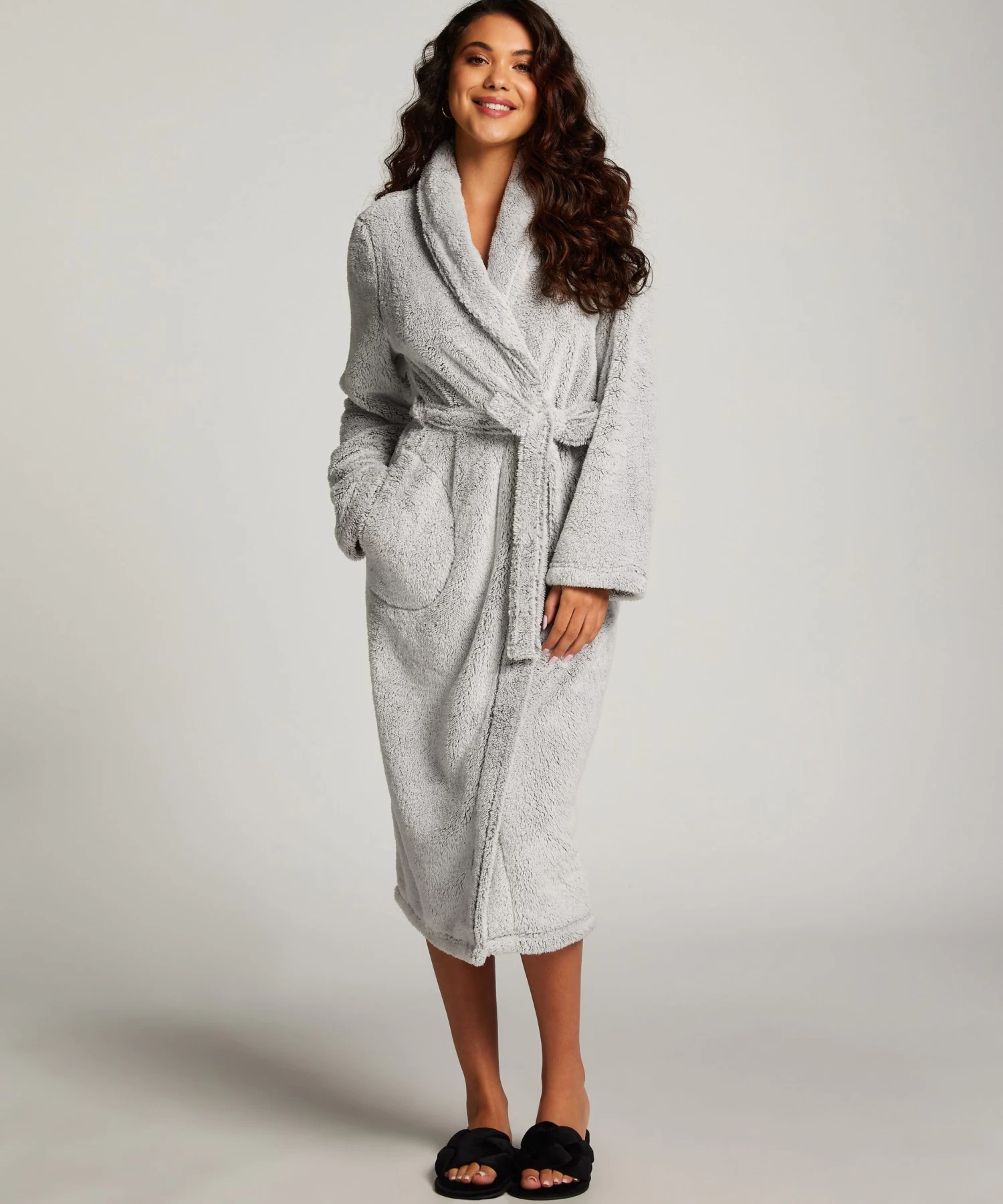 Heerlijke zachte badjas! Deze lange badjas valt over de knieën. Met een wikkelsluiting en steekzakken.